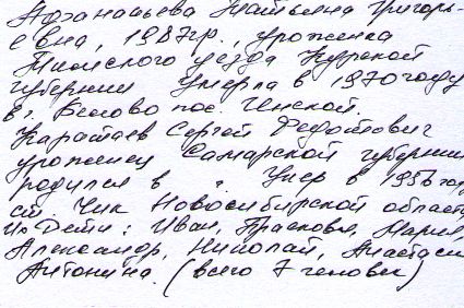 Афанасьева Татьяна Григорьевна, 1887 г.р., уроженка … уезда Курской губернии, умерла в 1970 году в г. Белово, пос. Инской.